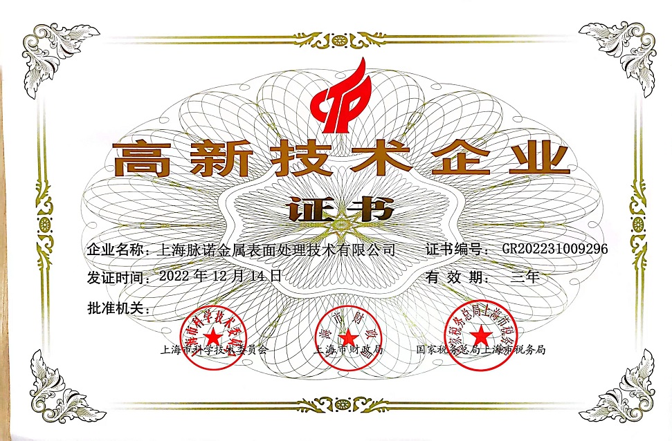 近日,上海脈諾金屬表面處理技術(shù)有限公司(上海脈諾)收到由上海市科學(xué)技術(shù)委員會、上海市財(cái)政局、國家稅務(wù)總局上海市稅務(wù)局聯(lián)合頒發(fā)的《高新技術(shù)企業(yè)證書》,發(fā)證時(shí)間為2022年12月14日,有效期三年。