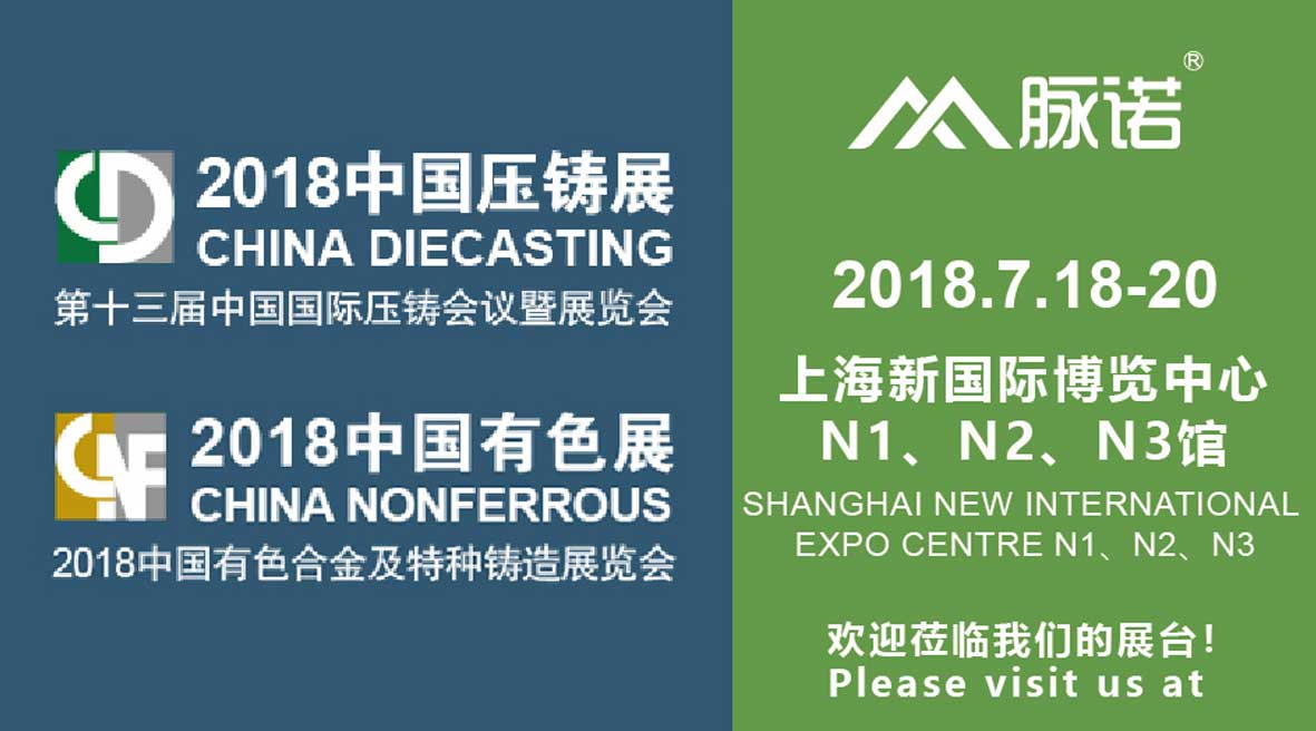 上海脈諾參加2018年07月18日—20日在上海新國(guó)際博覽中心開(kāi)幕的第十三屆中國(guó)國(guó)際壓鑄會(huì)議暨展覽會(huì)。